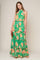 A printed woven maxi dress featuring halter neckline, sleeveless, layered skirt, back neck tie and smocked back waistband