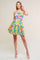 A printed woven mini dress featuring strapless, tiered skirt and smocked back bodice
