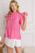 A solid woven top featuring a ruffled high neckline, double ruffled sleeve, and back neck button closure