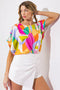 A textured woven top featuring round neckline, short puff sleeve with cuff and front button down closure
