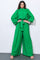 This impeccably crafted woven jumpsuit boasts a classic shirt collar, button down front, long sleeves, an elasticized waist, self-tie sash, convenient side pockets, and a flattering wide leg design.