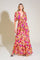 A printed woven maxi dress featuring V neckline, short flutter sleeve, elasticized waist and tiered skirt