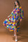 A printed woven midi dress featuring shirt collar, long sleeve with cuff, button down, elasticized waist with self sash tie and ruffled hemline