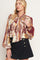 A printed woven top featuring front bow tie, long sleeve with smocked cuff and front button down closure
