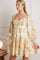 A printed woven mini dress featuring a sweetheart neckline, long sleeve with smocked cuff, smocked bodice, and tiered skirt