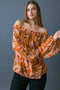 A printed woven top featuring ruffled high neckline, long sleeve with smocked cuff, back neck button closure and cami