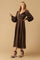 An embellished woven midi dress featuring a surplice neckline, long sleeve with smocked cuff, A-line skirt, and back zipper closure