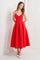 A solid red woven midi dress featuring cami top, full skirt and back zipper closure