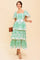A printed woven midi dress featuring square neckline, short sleeve, side cut out, layered skirt and back zipper closure