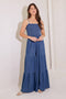 A strapless, solid black and white midi dress featuring a knit bodice, a full woven skirt, and a back zipper closure.