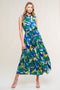 A printed woven midi dress featuring round neckline sleeveless, self belt, full skirt and back zipper closure