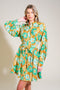 A printed woven jumpsuit featuring V neckline, kimono sleeve, side attached self sash and wide leg