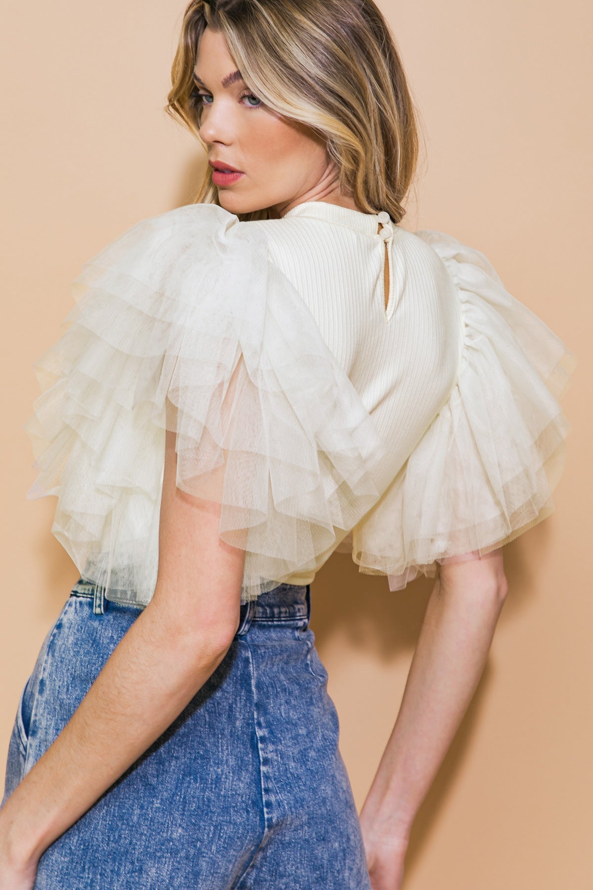 A ribbed knit bodysuit featuring round neckline, rhinestone neck trim, mesh layer contrast sleeve and bottom snap closure