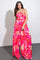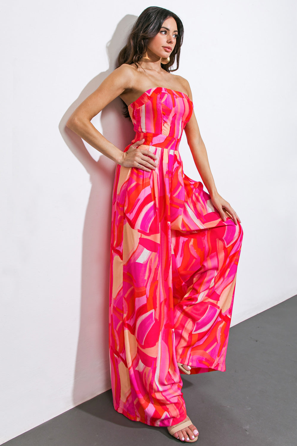 A printed woven jumpsuit featuring straight neckline, side pockets, wide leg and smocked back bodice