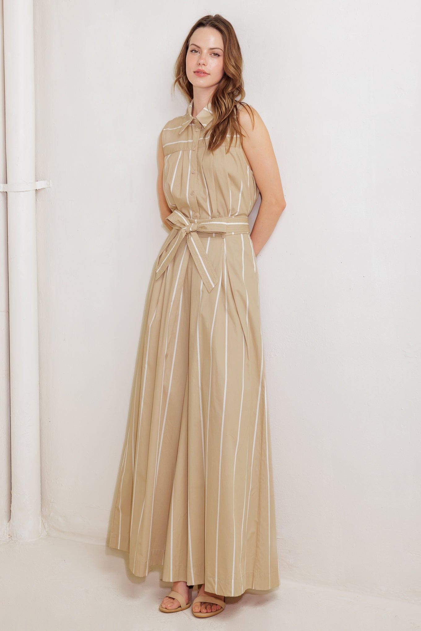 A striped woven top featuring collar, sleeveless, button down and pleated front and back.