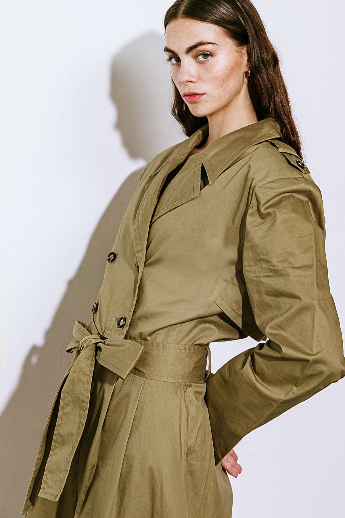 The SOUNDS IN MY MIND WOVEN JUMPSUIT is the perfect mix of style and comfort. Crafted from a woven fabric with a trench coat top, front closure, long sleeve, and wide leg fit, this jumpsuit ensures optimal range of motion and breathability. Whether you're dressing up for work or a night out, the fashionable look is sure to turn heads.