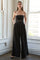 A solid woven jumpsuit featuring tube top, front tie, wide leg, side pockets and back zipper closure