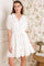 Indulge in the opulence of our STARLIGHT SOIREE WOVEN EYELET MINI DRESS, adorned with delicate collar detailing, a beautiful V neckline, whimsical short puff sleeves, and a charmingly ruffled hemline. The addition of an elasticized waist and a self tie adds a touch of sophistication to this exquisite piece.