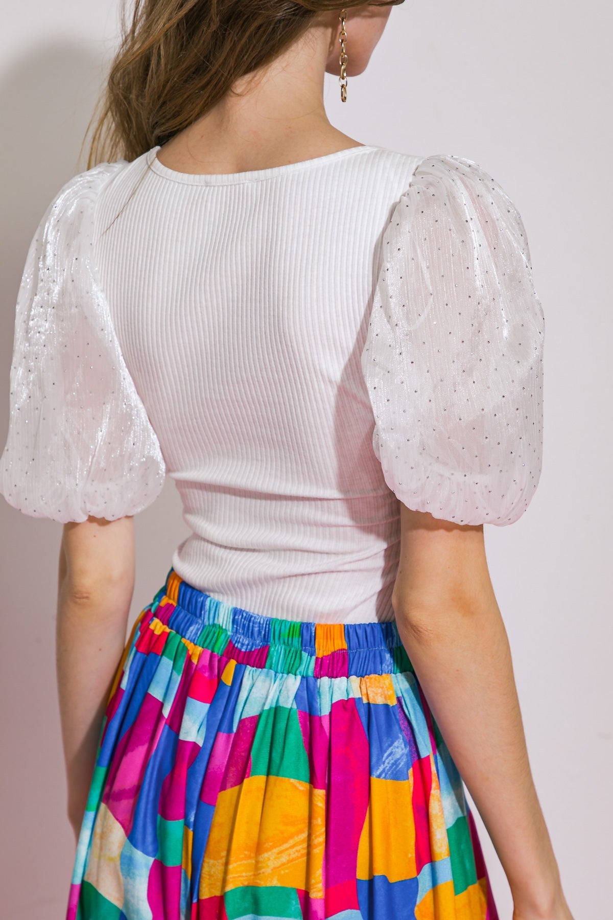 A ribbed knit bodysuit featuring square neckline, woven contrasting short sleeve and bottom snap closure
