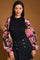 A sweater knit top featuring round neckline with contrasting printed woven long sleeve