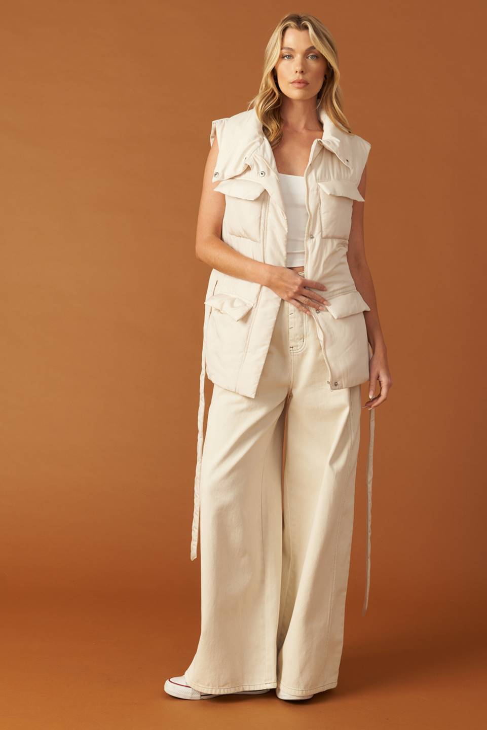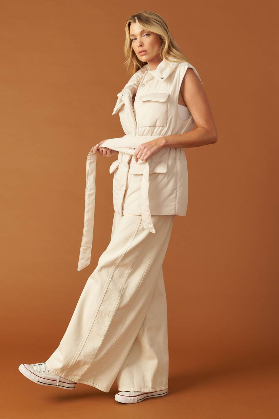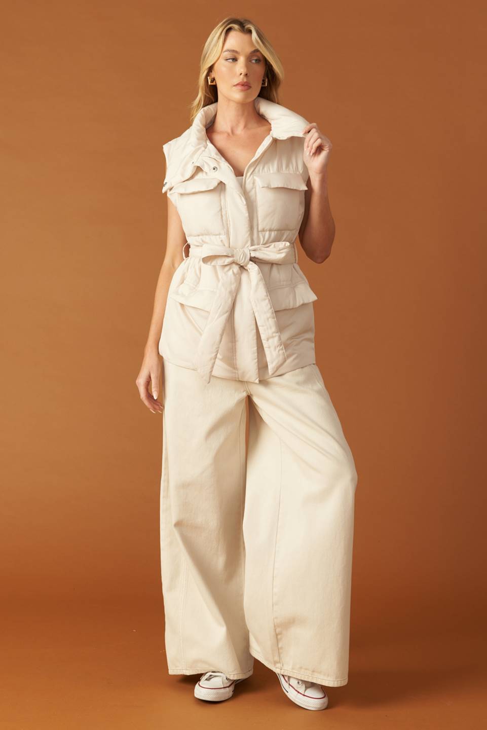 A puffer vest featuring high neckline with snap button, 4 front pocket with self sash tie