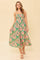 A printed woven midi dress featuring pleated bodice, straight neckline with shoulder strap, full skirt and back zipper closure