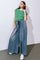 A washed denim pant featuring elasticized waist, contrasting front tie, side pockets and extra wide leg