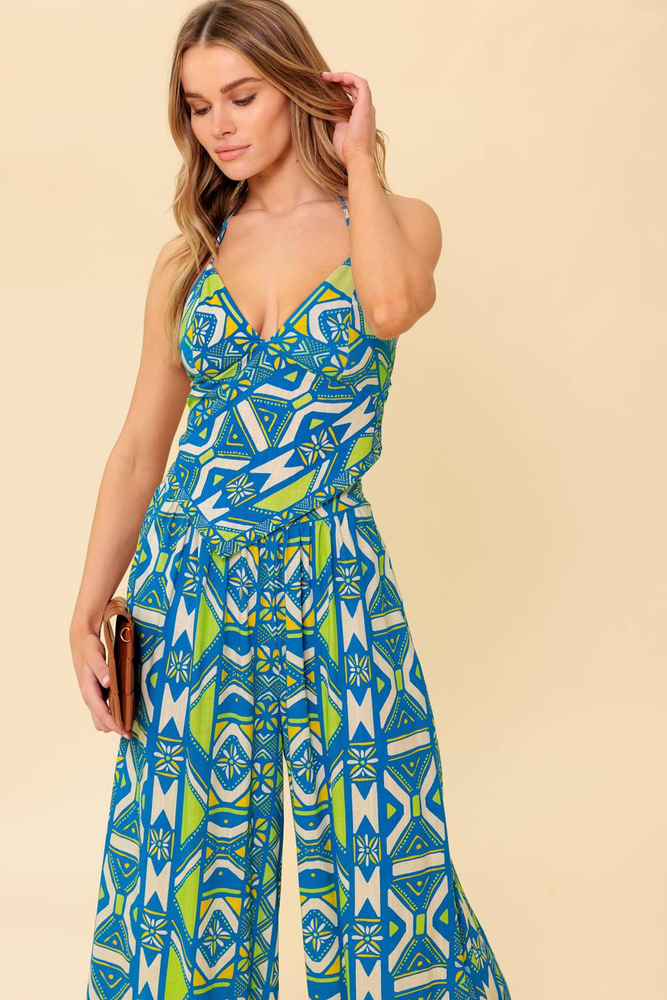 A printed woven top and pant set. Top featuring cami top with scarf body and back neck tie. Wide leg pant with elasticized back waistband