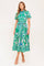 A printed woven midi dress featuring collar, short sleeve, button down, self sash tie and full skirt.