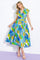 A printed woven midi dress featuring shirt collar, surplice neckline, short sleeve, full skirt and smocked waist band