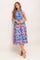 A printed woven midi dress featuring halter neckline, lace inset detail, full skirt, bare back with tie and smocked back waistband
