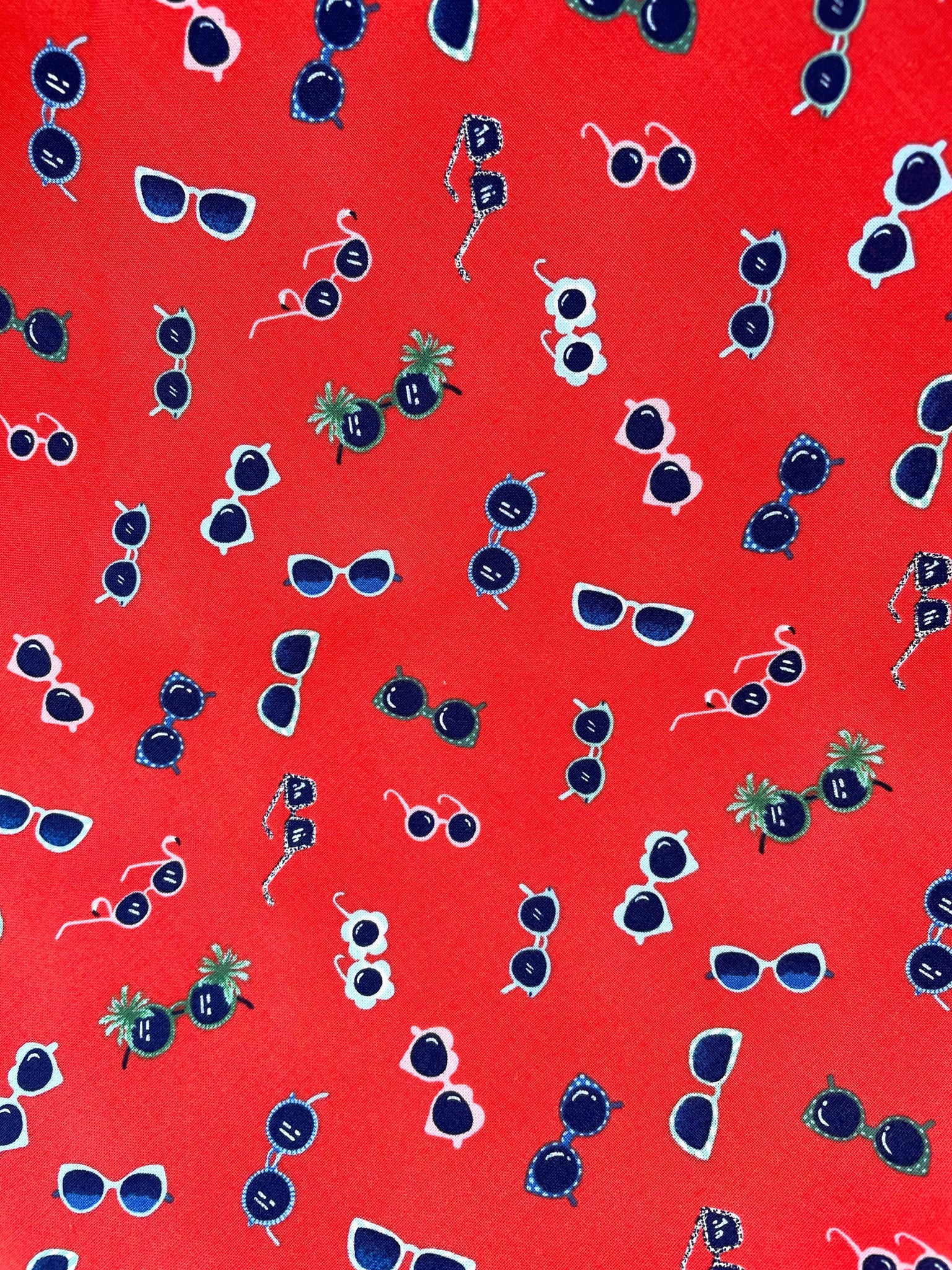 A vintage style piece with fun, modern details in our fun sunglasses print. Made from 100% cotton, this classic 1950's inspired dress features a high neckline, longer length skirt with hidden side pockets and back zippered closure.