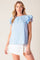 A blue and white textured woven top featuring round neckline, double layer ruffled sleeve and back neck button closure.