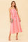 A printed woven lace midi dress featuring straight neckline with ruffled edge, straps and self sash tie