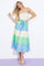 A color blocked woven lace midi dress featuring straight neckline, elasticized and self sash tie