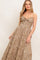 A printed woven midi dress featuring twisted cami bodice, straps, full skirt and smocked back with zipper closure