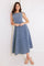 A printed denim midi dress featuring round neckline, sleeveless, circle skirt, low back with zipper closure