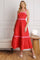 A solid woven midi dress featuring a straight neckline, ric rac trimmed, ruffled hemline and smock back bodice