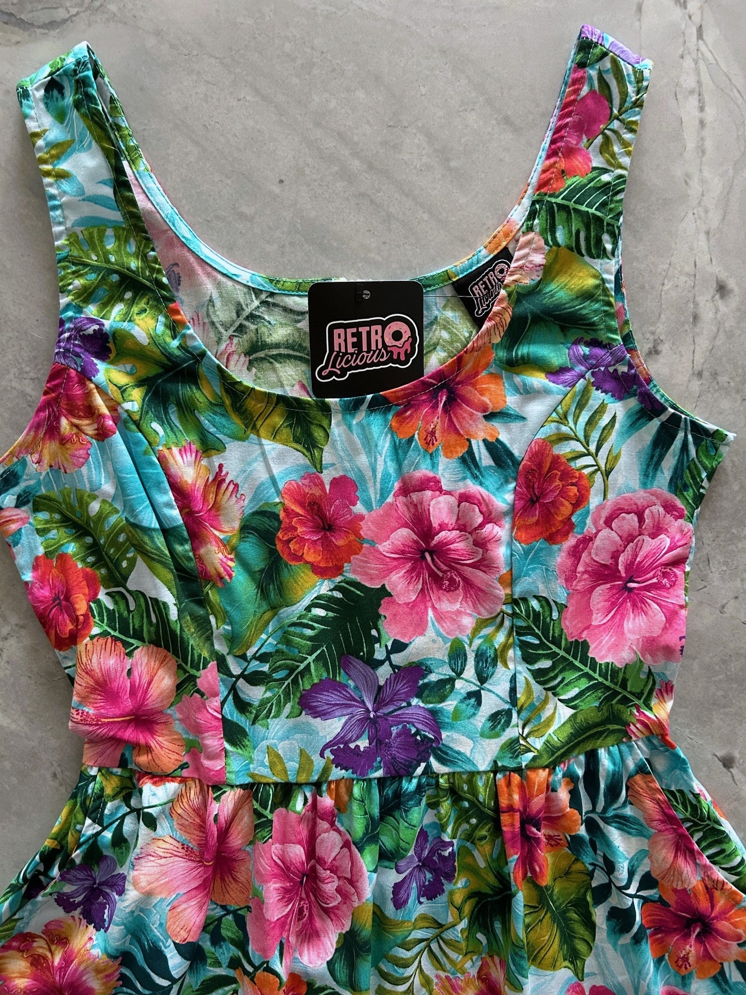 Elevate your retro style with our Tropical Fit & Flare Dress. Adorned with vibrant tropical flowers , this longer-length dress captures the whimsy of vintage fashion. The fit & flare silhouette adds a touch of elegance, making it perfect for any occasion. Step into a world of nostalgic charm and make a statement with the Tropical Fit & Flare Dress. Shop now and embrace retro style with a tropical twist.