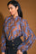 A jacquard woven top featuring ruffled neckline with front tie and long ruffle inset sleeve