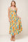 A printed woven midi dress featuring sweetheart neckline with twisted bodice detail, front cut out, straps, A line skirt and back zipper closure.