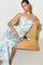 A printed woven cropped cami top with back zipper closure. Matching tiered skirt with back zipper closure.