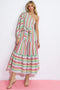 A printed woven mini dress featuring round neckline, long sleeve with smocked cuff, elasticized waist with self sash tie, ruffled hemline and back neck button closure