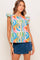 A printed woven top featuring round neckline, double ruffled sleeve and back keyhole button closure