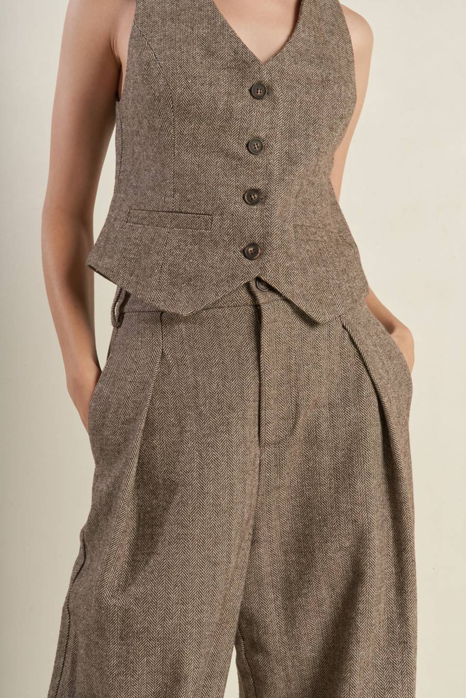 A woolen pant featuring front pleat, side pocket, front closure and wide leg. Matching vest VIBRANT DAZE WOVEN VEST