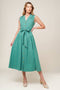 A printed woven midi dress featuring collar, short puff sleeve with cuff, button down closure and self sash tie