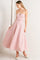 A solid woven midi dress featuring strapless with V front, self belt, circle skirt and back zipper closure