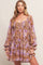 A printed woven mini dress featuring sweetheart neckline, smocked bodice, long sleeve with ruffled cuff and tiered skirt