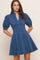 A washed denim mini dress featuring collar, front V, short puff sleeve, circle skirt and back zipper closure