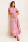 A printed woven maxi skirt featuring elasticized waist with contrasting tie and tiered bottom.